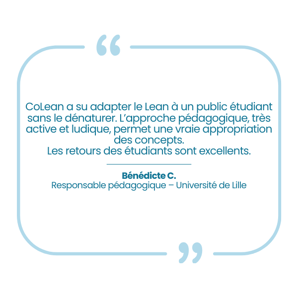 CoLean intervient auprès des dirigeants, managers, équipes et établissements de formation. Nous combinons méthodes Lean éprouvées, pédagogies actives et expérimentation terrain pour transformer les organisations de manière concrète et durable.